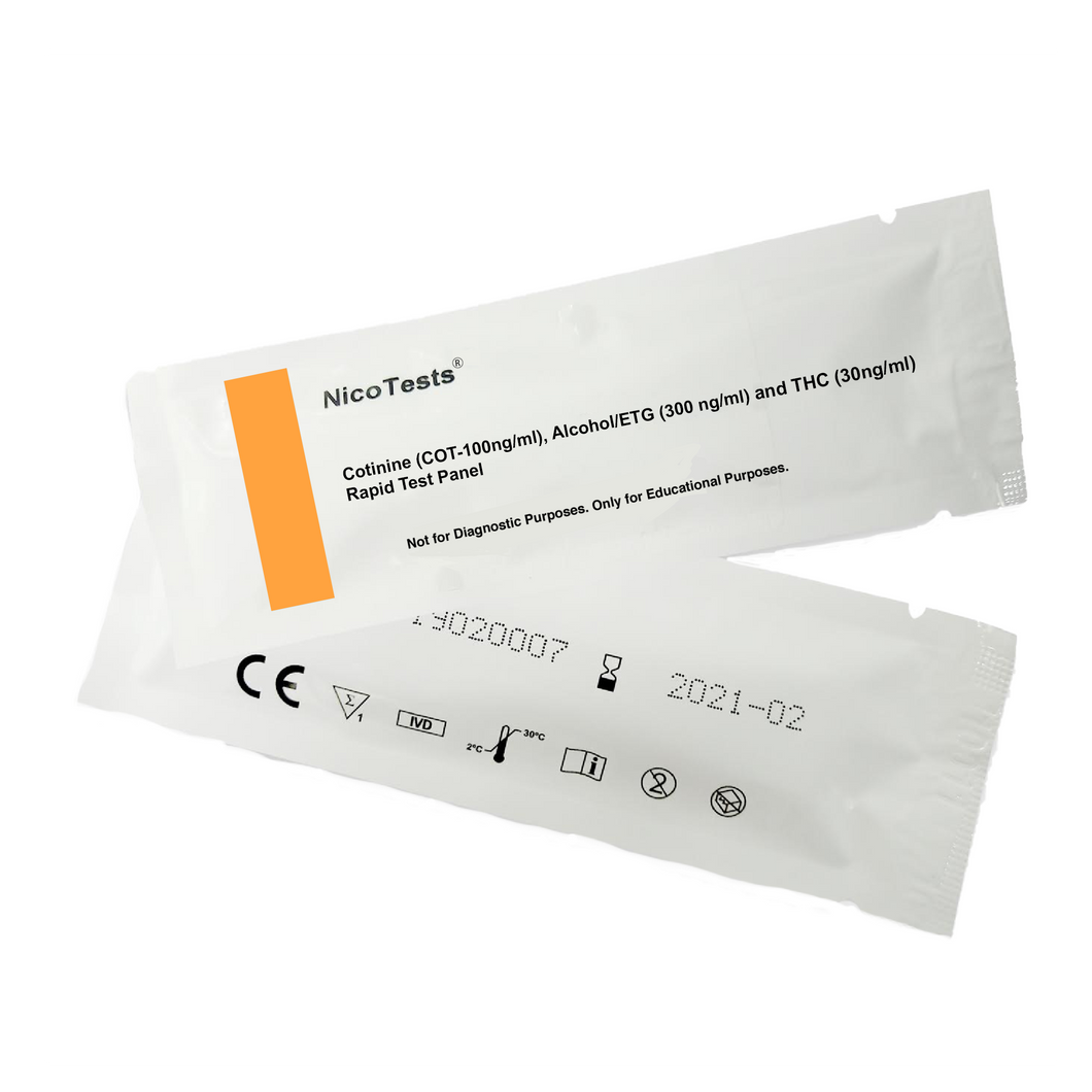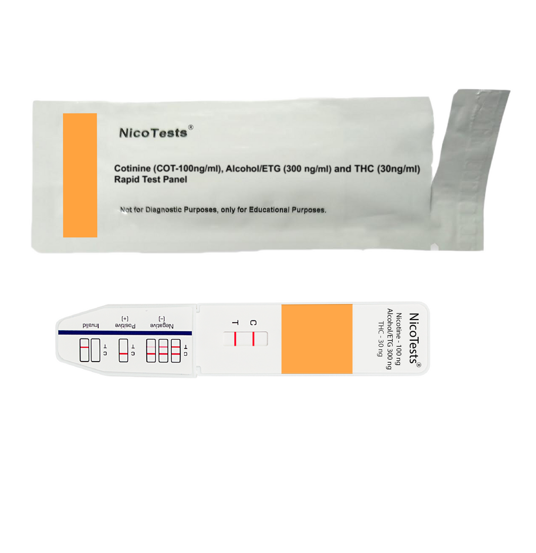 This is a 3 panel home drug test which separately detects the presence of THC, Nicotine, and Alcohol in the system. Each test kit show separate results for Marijuana, Nicotine and alcohol.